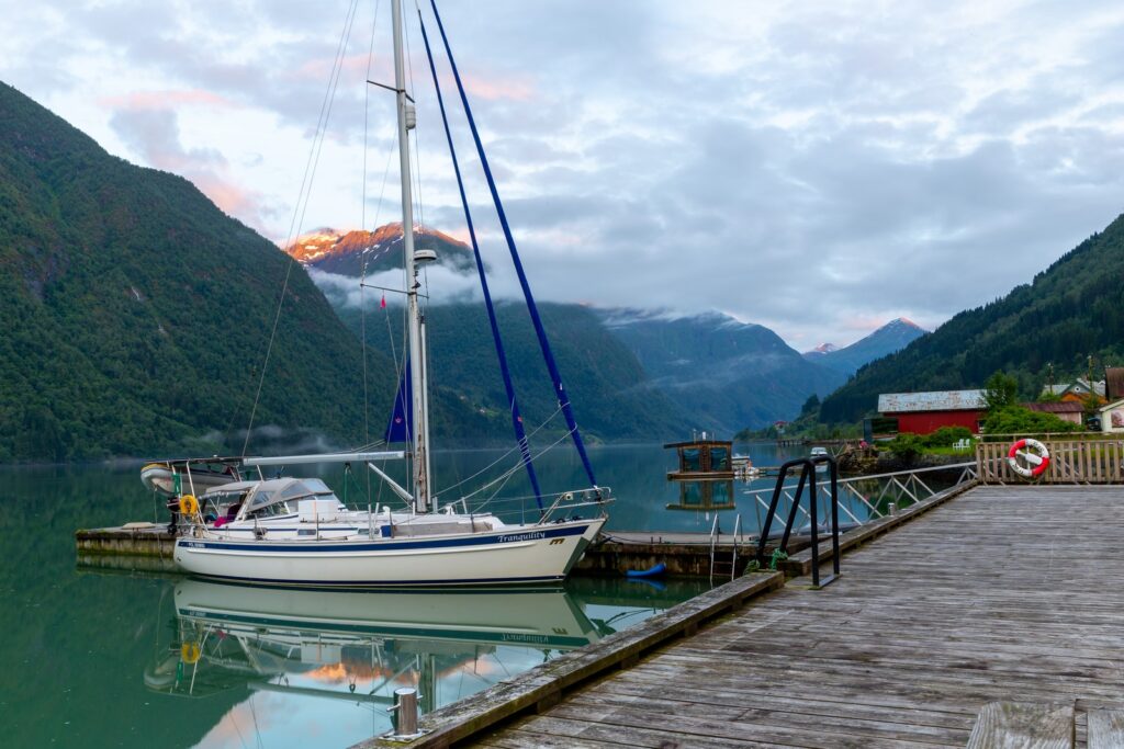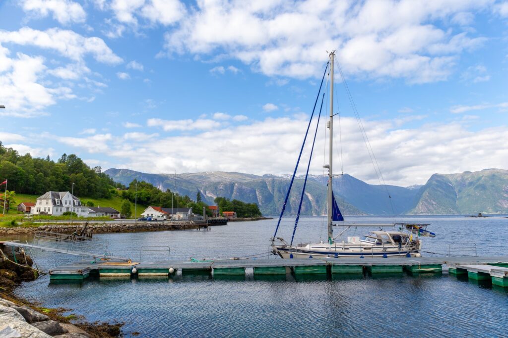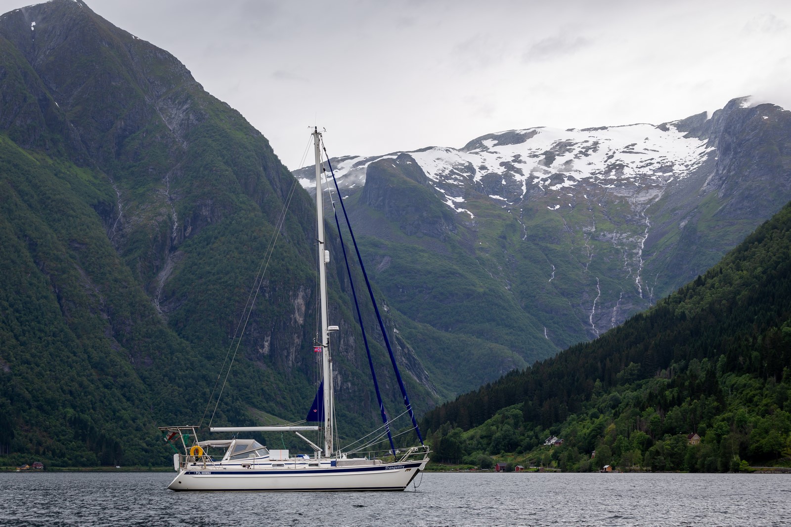 The 190-mile passage from Shetland to the Norwegian coast is spent mostly weaving our way between offshore platforms. But the moment we see the outline of land on the horizon, we know immediately that coming here is the right decision. Sognefjorden turns out to be a perfect choice — spectacular thousand-metre cliffs plunging straight into crystal-clear turquoise water, glaciers, lush greenery, and rural Scandinavian architecture leave us in awe once again.