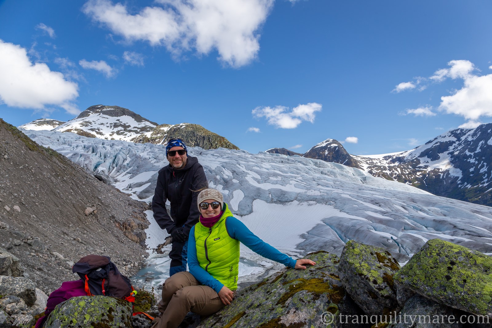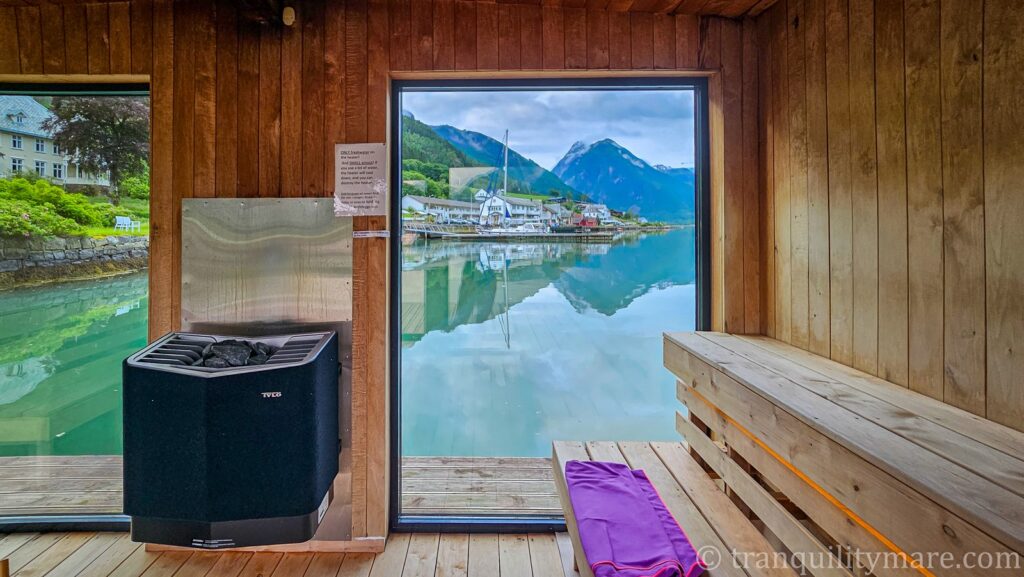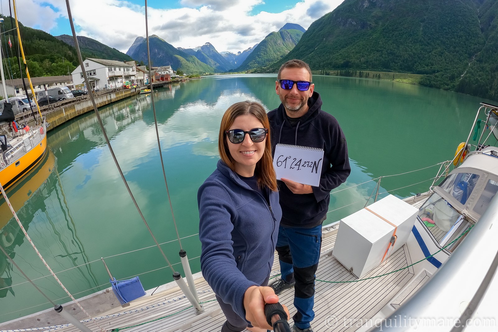 It is here that we reach the northernmost point of our journey. Fjaerland — a small settlement tucked into a branch of the main fjord — becomes the furthest north we travel: 61°24.272’N. The place looks like a postcard: Tranquility alone at a small pier, a glacier in the background, the setting sun lighting up the mountain peaks… and a sauna from which we can admire it all.