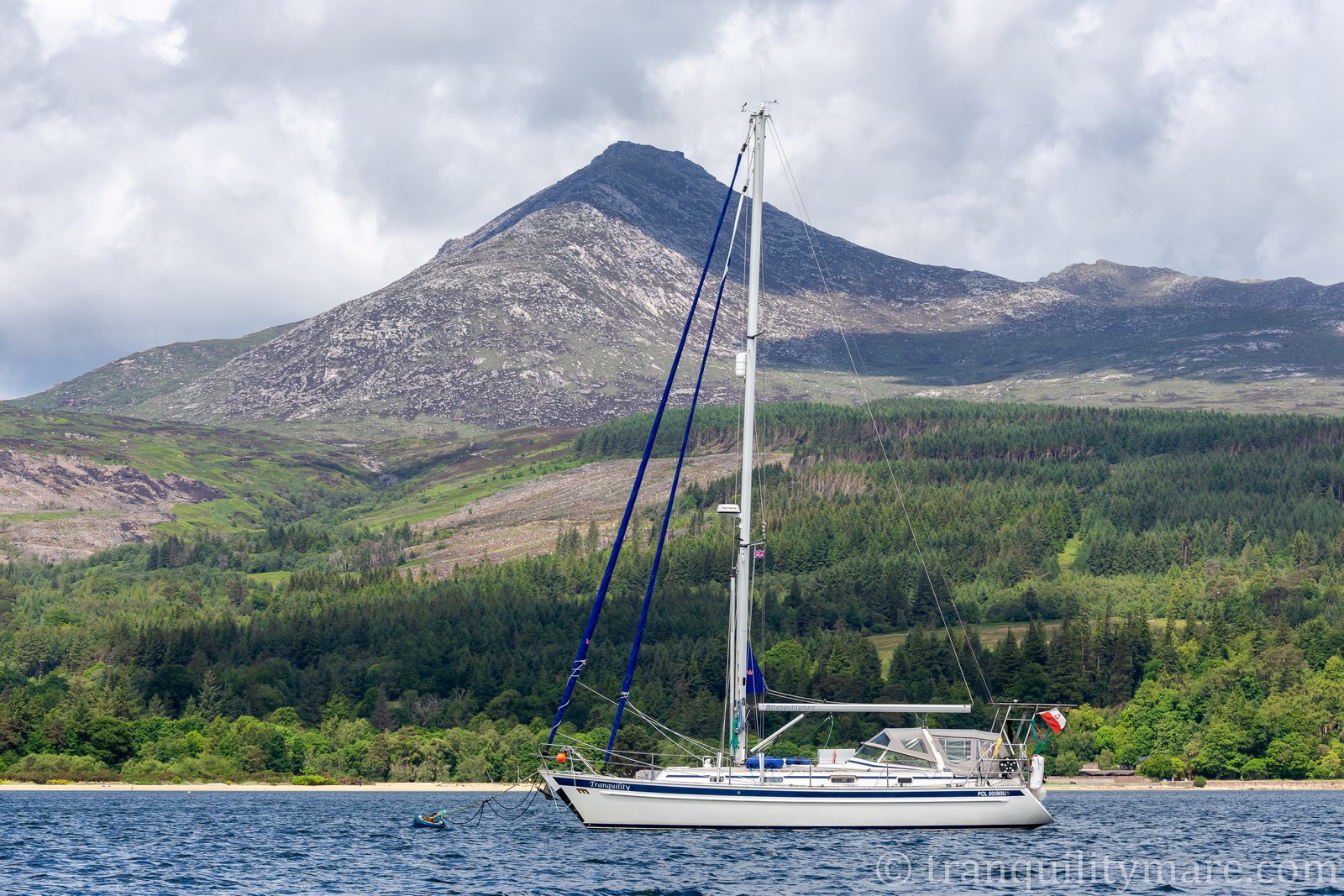 When the storm finally passes, we set course for our first Scottish island — Arran. We pick up a free mooring buoy near the main village, as the island doesn’t have a marina for yachts. From the very first moments, the landscapes leave us in awe — not yet realizing that the deeper we venture into Scotland, the more beautiful everything around us will become.